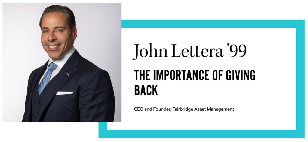 John Lettera is a 1999 magna cum laude graduate of the Elisabeth Haub School of Law at Pace University and served as the Managing Editor of Law Review. He is the CEO and Founder of Fairbridge Asset Management, formerly RealFi Financial LLC. Fairbridge is a leading, technology driven, alternative investment management firm with expertise in real estate credit strategies. Mr. Lettera’s involvement with the law school has been tremendous. He is a member of the Law School’s Board of Visitors and an Adjunct Professor at Haub Law. Most recently, he made a generous donation to the Law School which will serve as a five-year grant to name its Investor Rights Clinic after Fairbridge Asset Management—Fairbridge Investor Rights Clinic. He has also been an adjunct professor at the Law School since 2010, teaching courses in Real Estate Finance, Corporate Finance, and Venture Capital. Mr. Lettera has also supported the Law School through hiring many alumni over the years, generously sponsoring alumni events, and volunteering with the Center for Career and Professional Development. In 2013 and 2022, he received the Distinguished Service Award as part of the annual Law School Leadership Awards Dinner in recognition of his ongoing support.